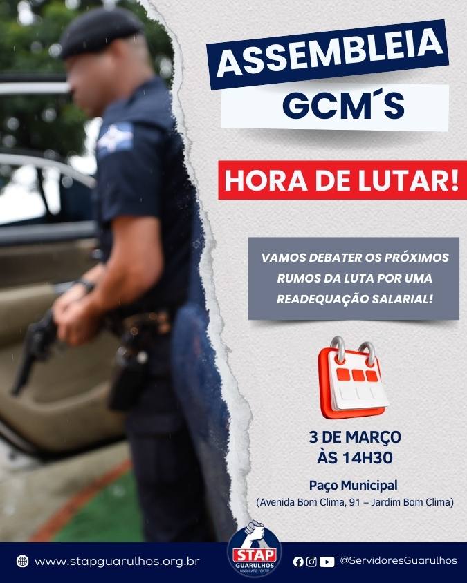 A Comissão de Guardas Civis Municipais, juntamente com o Sindicato dos Trabalhadores da Administração Pública (STAP), convoca todos os integrantes da Guarda Civil Municipal para assembleia geral no próximo dia 3 de março (terça-feira), às 14h30, em frente ao Paço Municipal.