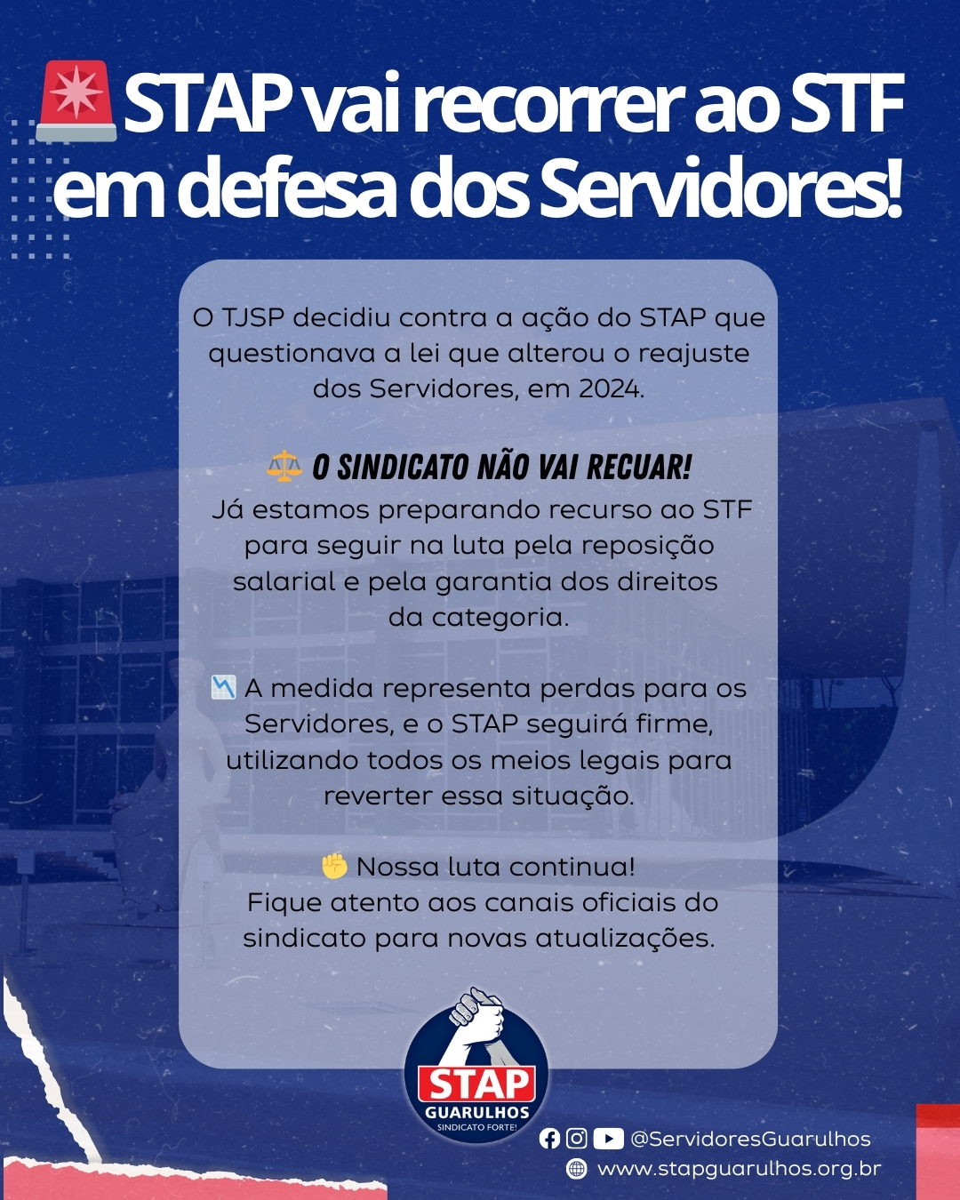 O Sindicato dos Trabalhadores na Administração Pública Municipal de Guarulhos (STAP) informa à categoria que irá recorrer ao Supremo Tribunal Federal (STF) após decisão do Tribunal de Justiça do Estado de São Paulo (TJ-SP) que julgou improcedente a Ação Direta de Inconstitucionalidade contra a Lei Municipal nº 8.263/2024.